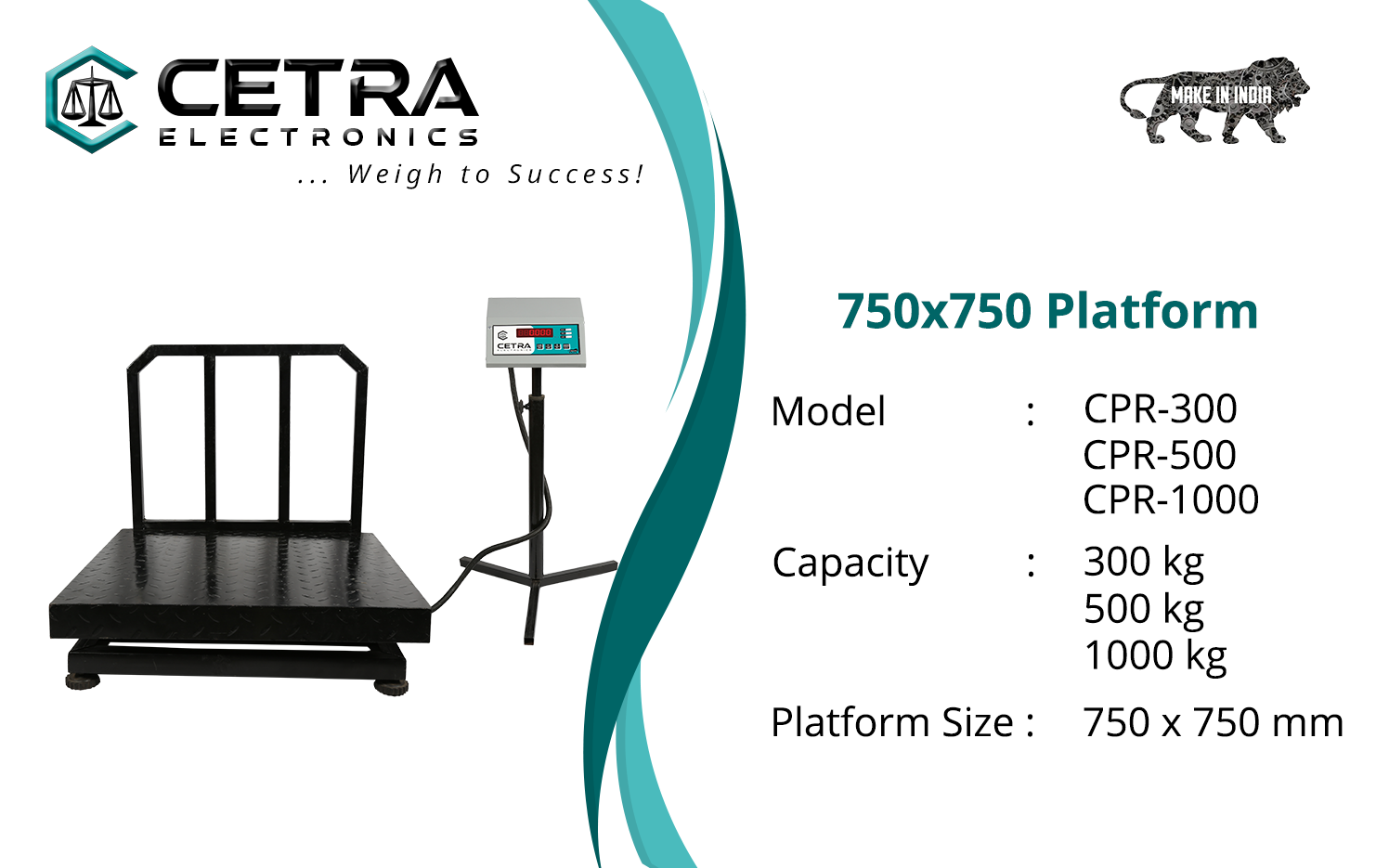 In the Platform category of weighing machines, we have the 750 x 750 checkered model as shown. This model has dimensions of 750 x 750 mm or in simpler terms 3/4th of a meter at all sides. At Cetra Electronics, we provide you with the CPR-300 model which provides a weighing capacity of up to 300Kg, the CPR-500 model for capacity of up to 500Kg and also the CPR-1000 model providing a capacity of up to 1000Kg.