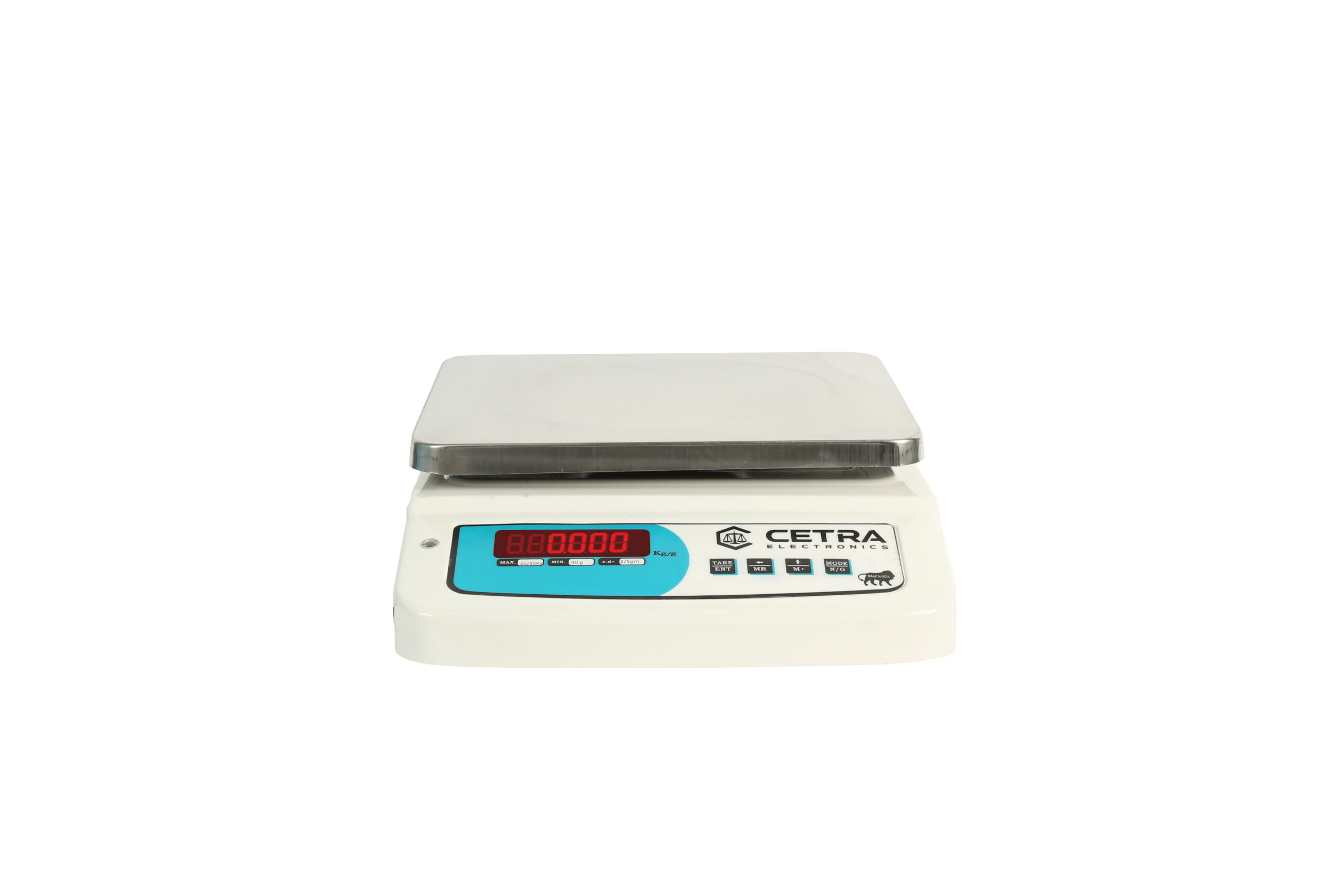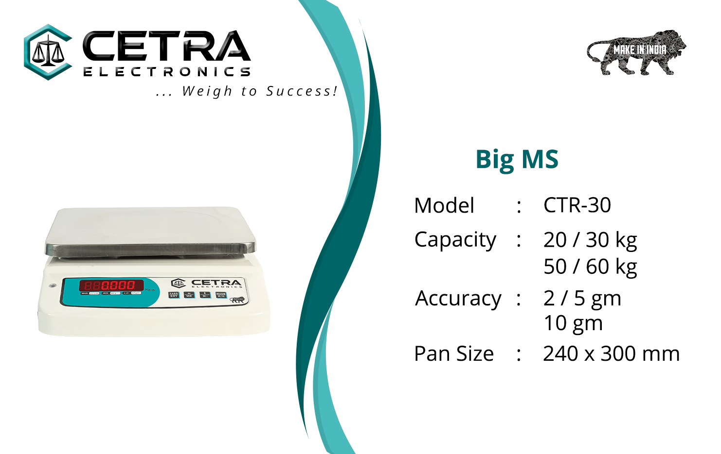 In the Tabletop category of weighing machines, we have the Big SS model as shown. This model has pan dimensions of 240 x 300 mm. At Cetra Electronics, we provide you with the 240 x 300 mm CTR-30 model which provides a weighing capacity of up to 30Kg. It also has an accuracy of 2/5 gm which makes it highly accurate machine for retailers.