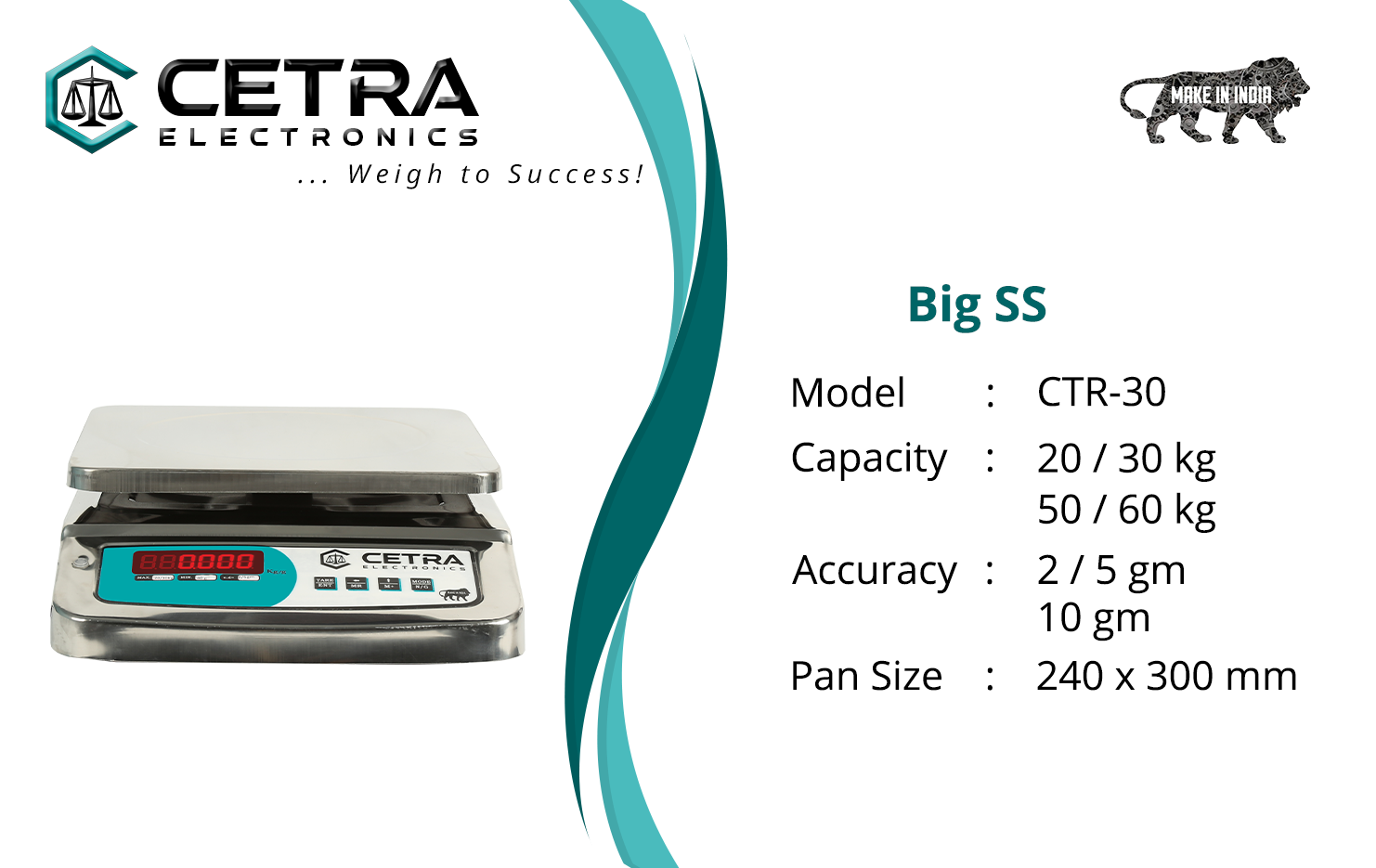 In the Tabletop category of weighing machines, we have the Big SS model as shown. This model has pan dimensions of 240 x 300 mm. At Cetra Electronics, we provide you with the 240 x 300 mm CTR-30 model which provides a weighing capacity of up to 30Kg. It also has an accuracy of 2/5 gm which makes it highly accurate machine for retailers.
