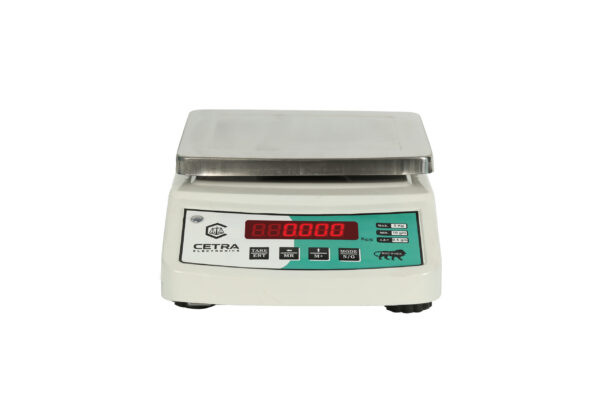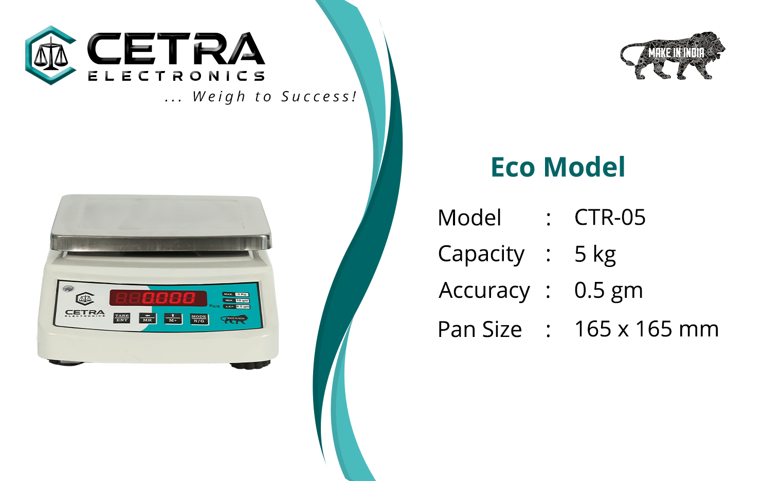 In the Tabletop category of weighing machines, we have the Eco model as shown. This model has pan dimensions of 165 x 165 mm. At Cetra Electronics, we provide you with the 165 x 165 mm CTR-20 model which provides a weighing capacity of up to 5Kg. It also has an accuracy of 0.5 gm which makes it highly accurate machine for retailers.