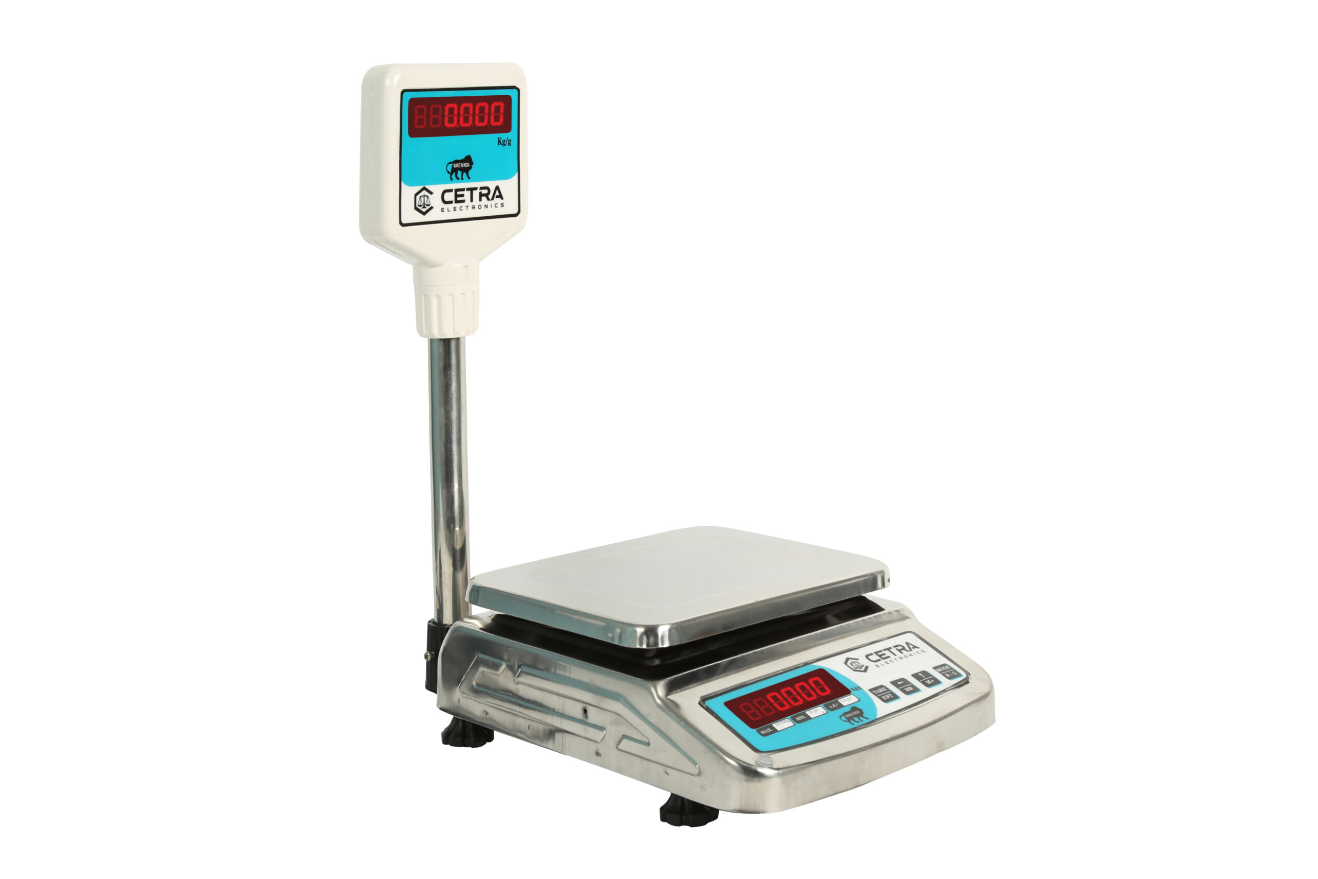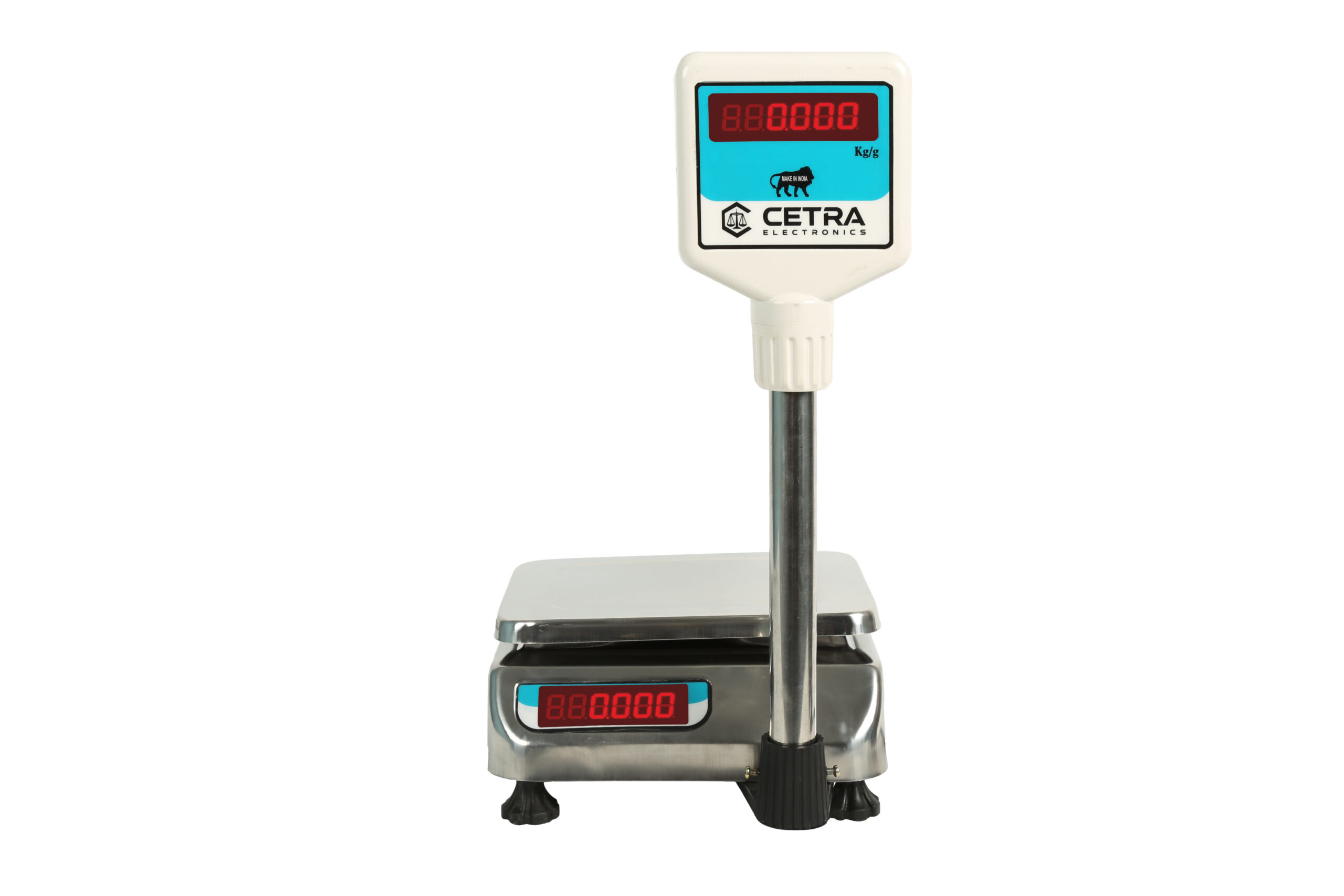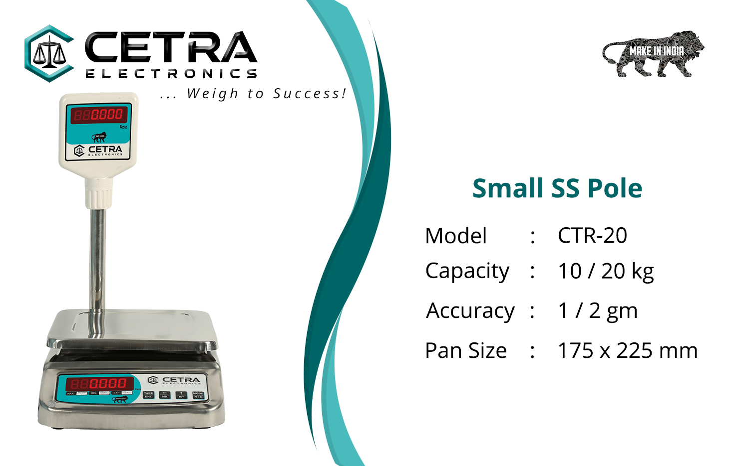 In the Tabletop category of weighing machines, we have the Small SS Pole model as shown. This model has pan dimensions of 175 x 225 mm. At Cetra Electronics, we provide you with the 175 x 225 mm CTR-20 model which provides a weighing capacity of up to 20Kg. It also has an accuracy of 0.5 gm which makes it highly accurate machine for retailers.