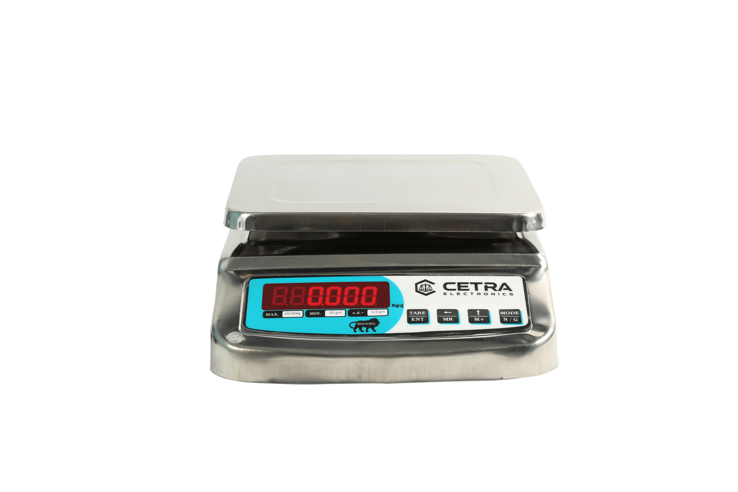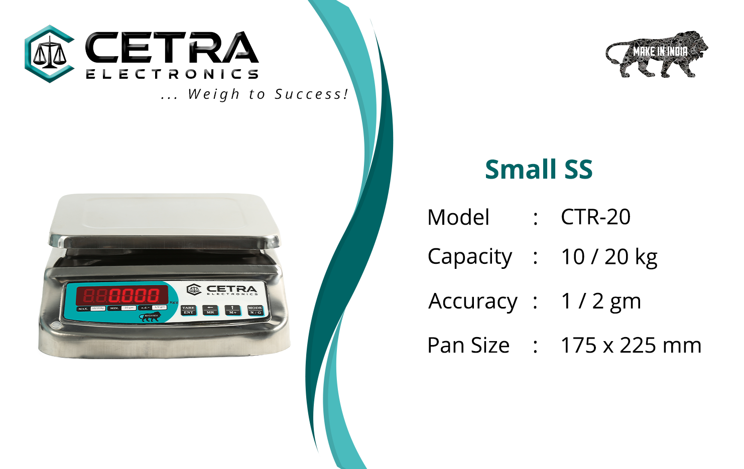 In the Tabletop category of weighing machines, we have the Small SSIB model as shown. This model has pan dimensions of 175 x 225 mm. At Cetra Electronics, we provide you with the 175 x 225 mm CTR-20 model which provides a weighing capacity of up to 20Kg. It also has an accuracy of 0.5 gm which makes it highly accurate machine for retailers.