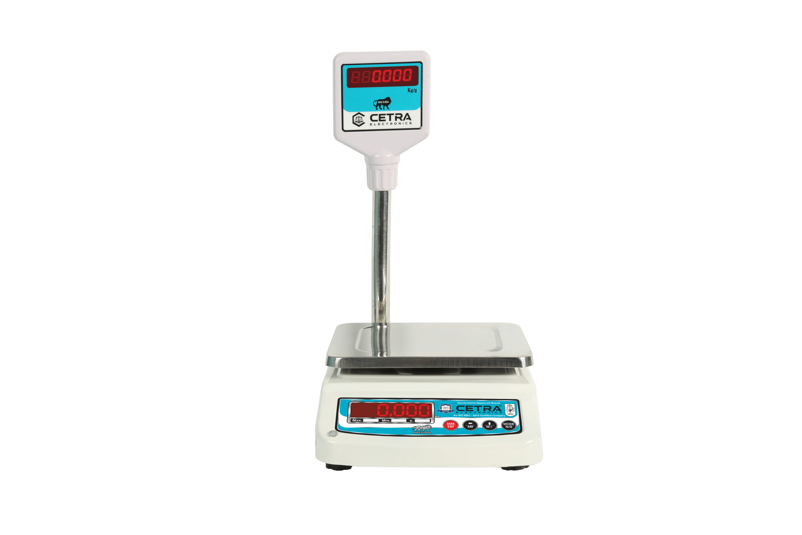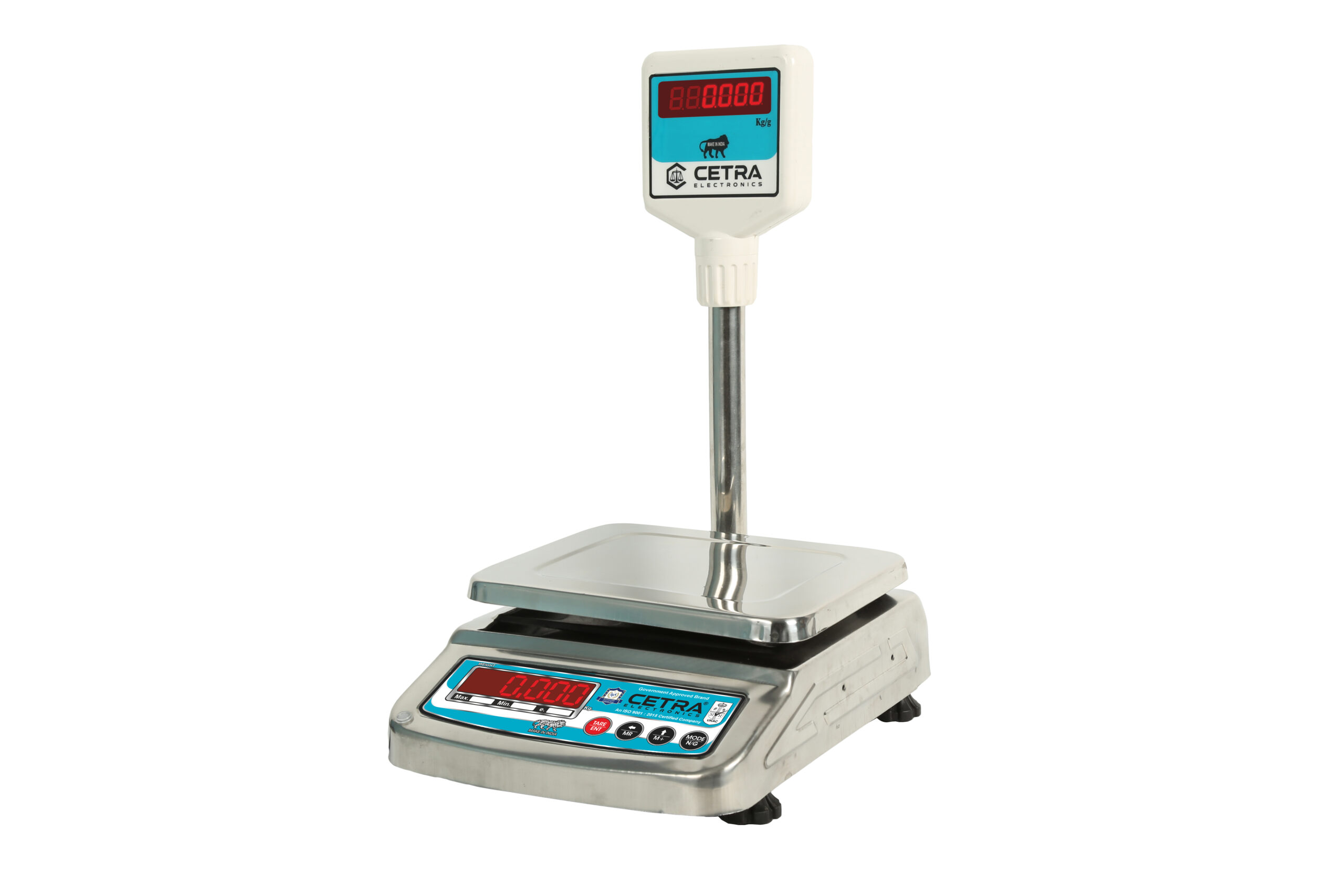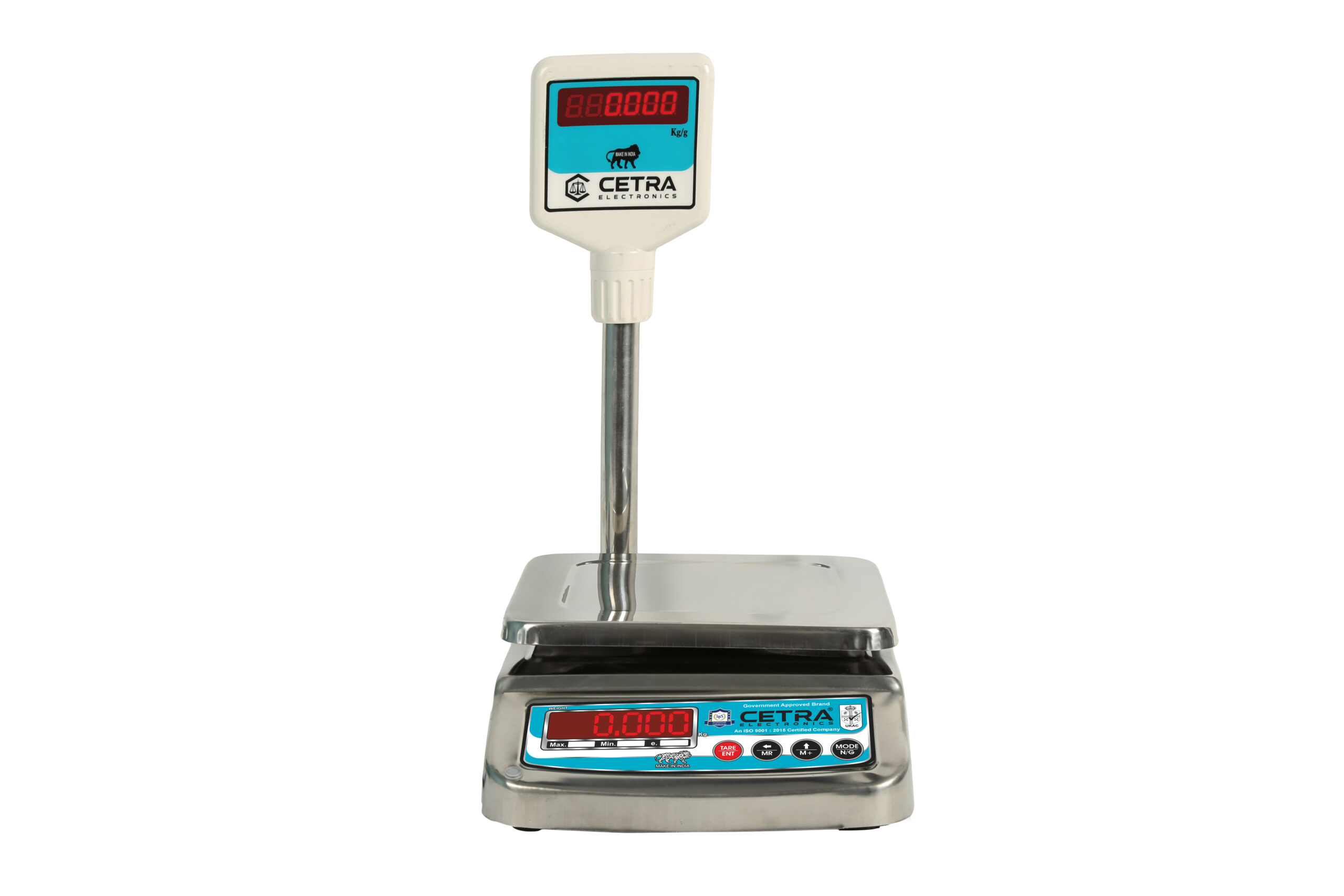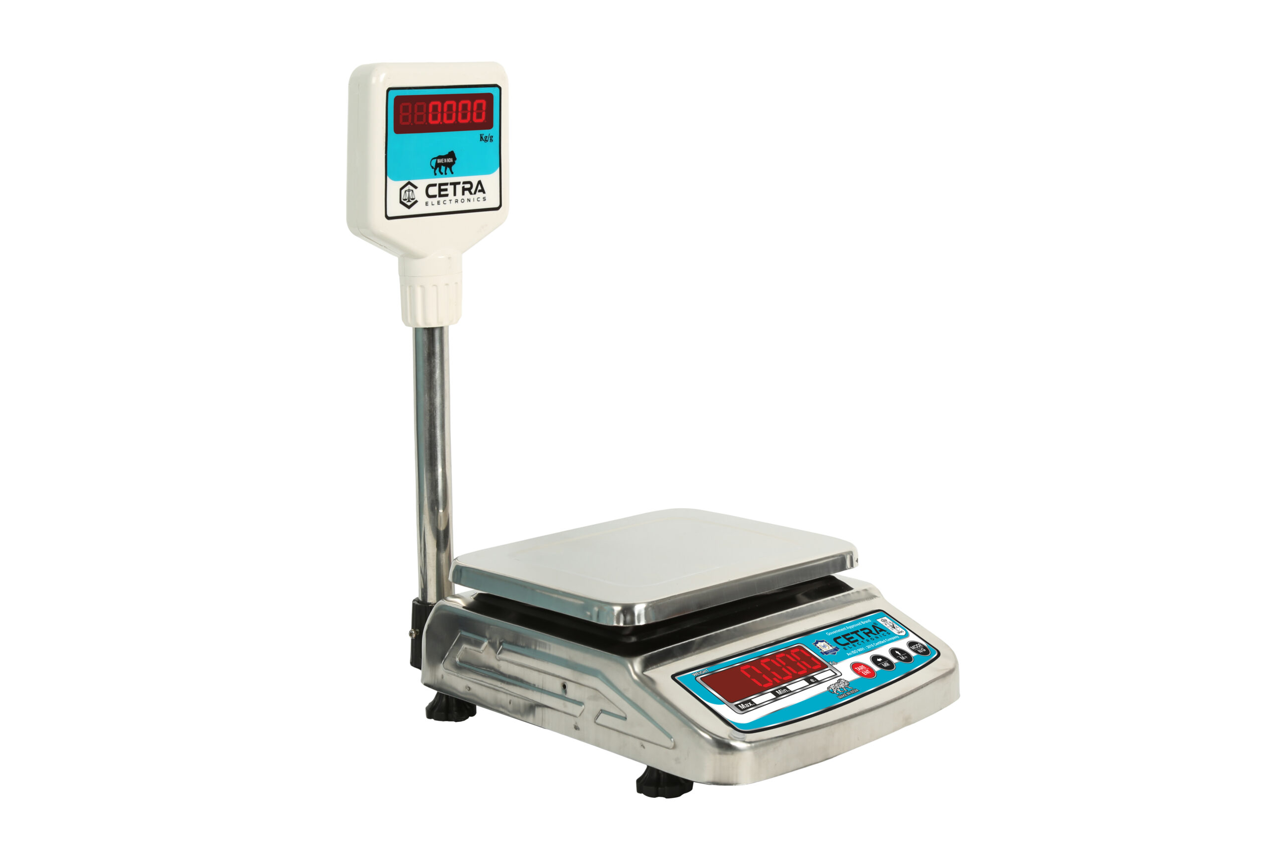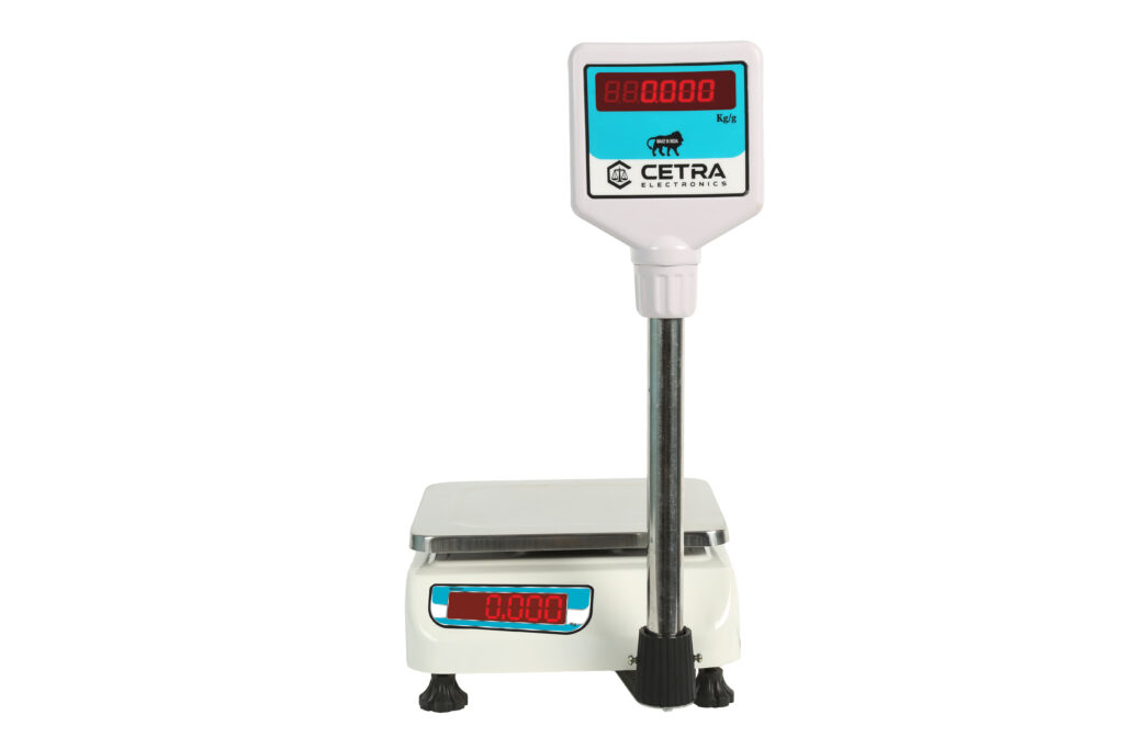 In the Tabletop category of weighing machines, we have the Small SS Pole model as shown. This model has pan dimensions of 175 x 225 mm. At Cetra Electronics, we provide you with the 175 x 225 mm CTR-20 model which provides a weighing capacity of up to 20Kg. It also has an accuracy of 0.5 gm which makes it highly accurate machine for retailers.